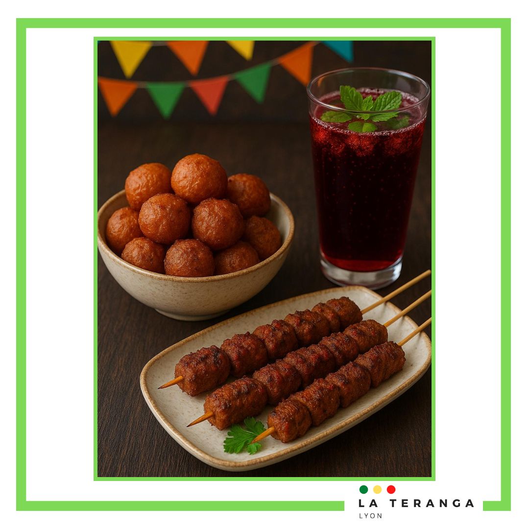 Brochettes d’épices africaines : Dés de viande (bœuf ou poulet) marinés dans un mélange d’épices (paprika, cumin, coriandre) et grillés.