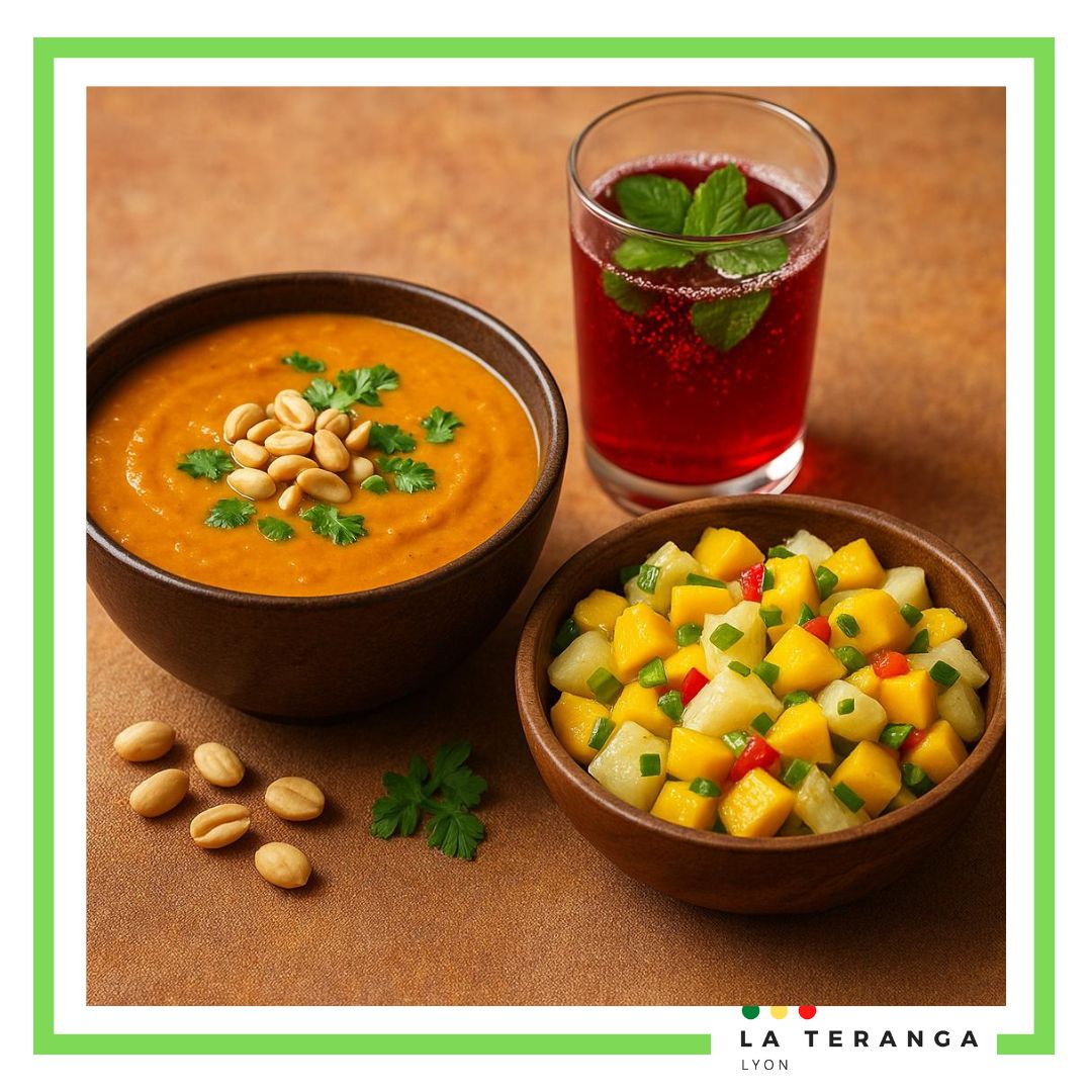Soupe de patates douces et cacahuètes : Une entrée crémeuse, légèrement épicée, typique d’Afrique de l’Ouest.